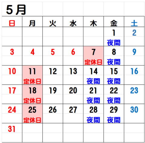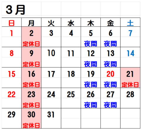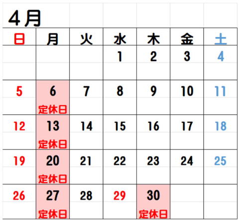 | ● 定休日 月曜日・祝日の翌日 *月曜祝日の場合は営業致します。 *連休の場合は営業する場合があります。 カレンダーをご確認下さい。 |