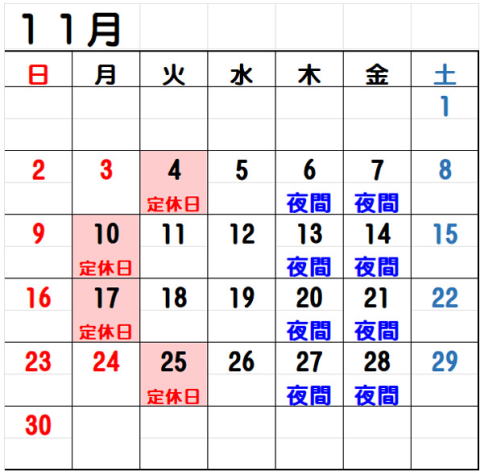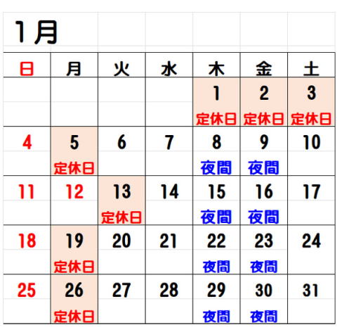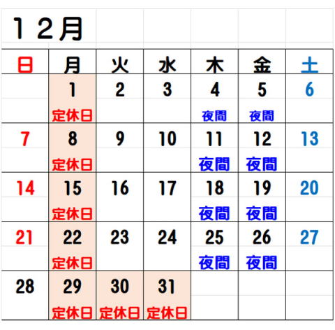 ● 定休日 月曜日・祝日の翌日 *月曜祝日の場合は営業致します。 *連休の場合は営業する場合があります。 カレンダーをご確認下さい。 |